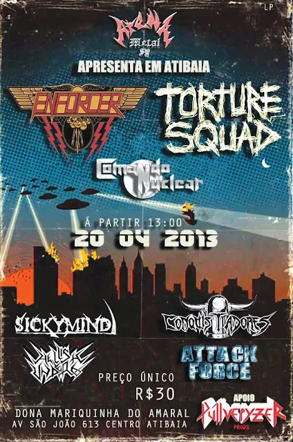 Home > Torture Squad > ENFORCER em Atibaia ENFORCER em Atibaia No dia 20 de Abril em Atibaia/SP Local: Dona Mariquinha Do Amaral - AV. São João,615 Centro A Partir das 13 HS com as Bandas TORTURE SQUAD, COMANDO NUCLEAR, HELLISH UNDEAD, ATTACK FORCE, SICKYMIND, ENFORCER & CONQUISTADORES Attack Force Comando Nuclear Conquistadores Enforcer Hellish Undead Shows Sickymind Torture Squad