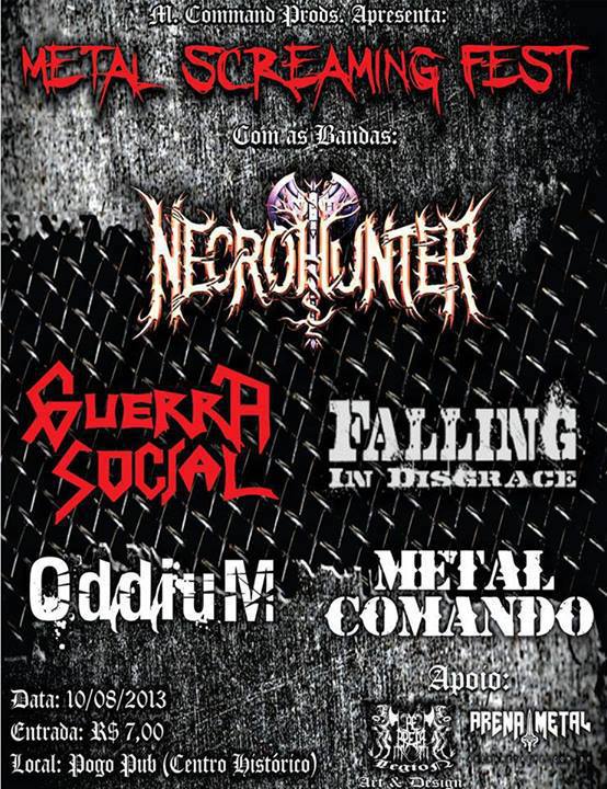 Home > Shows > Metal Screaming Fest Metal Screaming Fest No dia 10 de Agosto em João Pessoa/PB Local: Pogo Pub - Praça Antenor Navarro,22 A Partir das 21 HS com as Bandas FALLING IN DISGRACE, GUERRA SOCIAL, METAL COMANDO, NECROHUNTER & ODDIUM Falling in Disgrace Guerra Social Metal Comando Necrohunter Oddium Shows