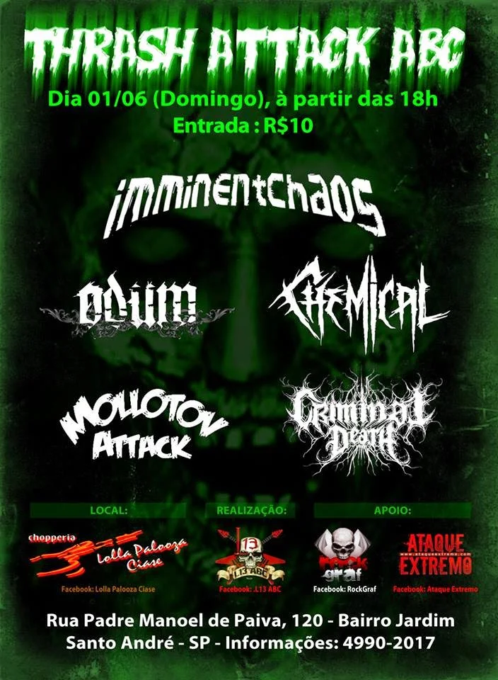 Home > Shows > THRASH ATTACK ABC THRASH ATTACK ABC No dia 01 de Junho em Santo André/SP Local: Lolla Palooza Ciase - Rua Padre Manoel de Paiva,120 Bairro Jardim A Partir das 18 HS com as Bandas CRIMINAL DEATH, MOLLOTOV ATTACK, IMMINENT CHAOS, CHEMICAL & ODUM Chemical Criminal Death Imminent Chaos Mollotov Attack Odum Shows