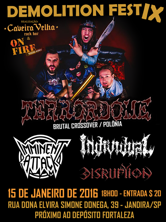 Home > Terrordome > DEMOLITION FEST IX DEMOLITION FEST IX No dia 15 de Janeiro em Jandira/SP Local: Caveira Velha Rock Bar - Rua Dona Elvira Simone Donega,13 (Prox. ao Depósito Fortaleza) A Partir das 18 HS com as Bandas TERRORDOME, IMMINENT ATTACK, INDIVIDUAL & DISRUPTION Disruption Imminent Attack Individual Shows Terrordome
