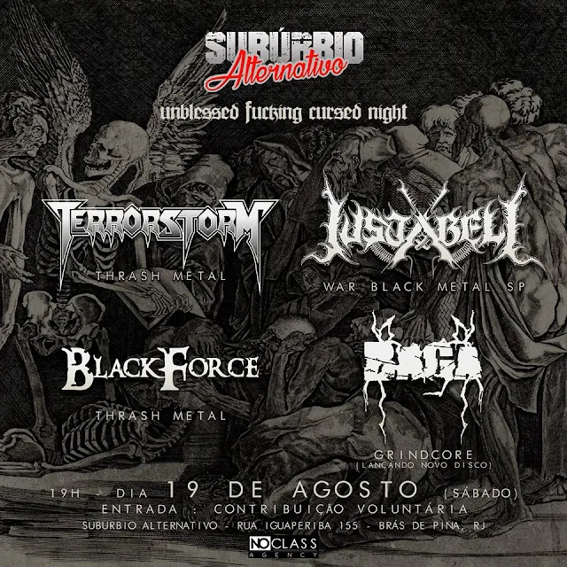 Home > Terrorstorm > UNBLESSED FUCKING CURSED NIGHT UNBLESSED FUCKING CURSED NIGHT No dia 19 de Agosto de 2017 em Brás de Pina/RJ Local: Subúrbio Alternativo - Rua Iguaperiba,155 A Partir das 19 HS com as Bandas JUSTABELI, TERRORSTORM, BLACKFORCE & BAGA Baga BLACKFORCE Justabeli Shows Terrorstorm