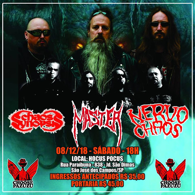 Home > Shows > MASTER em São José dos Campos MASTER em São José dos Campos No dia 08 de Dezembro de 2018 em São José dos Campos/SP Local: Hocus Pocus - Rua Paraibuna,838 Jardim São Dimas A Partir das 18 HS com Abertura das Bandas NERVOCHAOS & CHAOS SYNOPSIS Chaos Synopsis Master Nervochaos Shows
